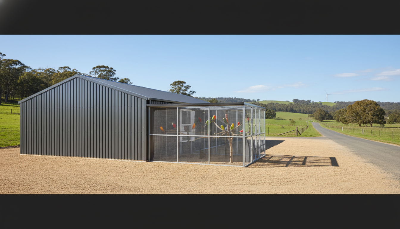 This guide addresses: sheds and aviaries; bird sheds and aviaries; steel sheds Perth; custom Colorbond garages Perth; custom carports Melbourne; rural sheds NSW; cyclone-rated sheds QLD; wind-rated sheds for cyclonic areas; Colorbond vs Zincalume comparison; farm machinery storage; DIY shed kits; affordable carports for Australian homes; council-approved sheds WA; aviary mesh; insulated shed panels; gable vs skillion roof; slab-on-ground footings; portal frame sheds; marine-grade fixings; bushfire BAL sheds.